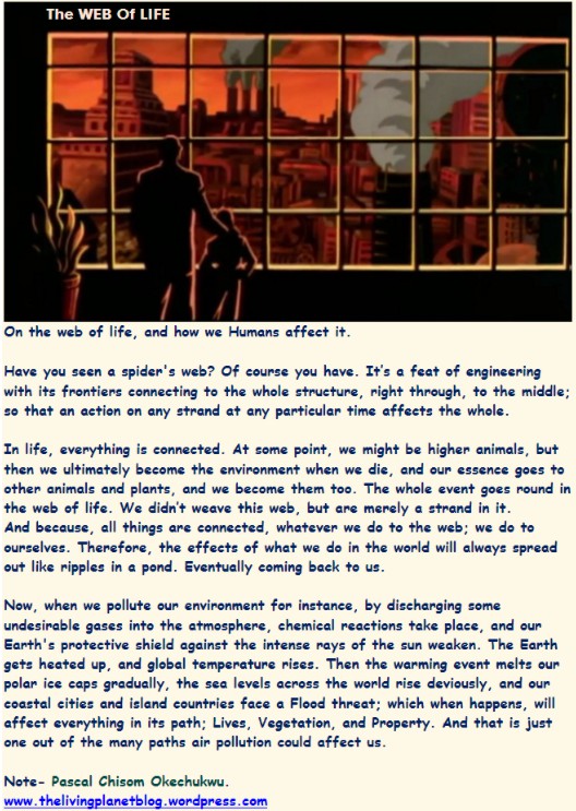 Human Activities, Life on Earth The WEB of LIFE Date: August 12, 2016Author: Pascal Chisom Okechukwu 0 Comments Note art by Pascal Chisom Okechukwu. A little more insight on what the Web of Life could mean to us. And what we mean to it. Share this: Share on Facebook (Opens in new window) Facebook Share on X (Opens in new window) X Share on WhatsApp (Opens in new window) WhatsApp Print (Opens in new window) Print More Share on Reddit (Opens in new window) Reddit Share on LinkedIn (Opens in new window) LinkedIn Share on Tumblr (Opens in new window) Tumblr Share on Pinterest (Opens in new window) Pinterest Like Loading... Related